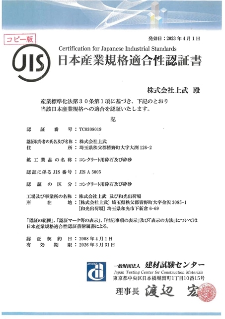 コンクリート分野拡大に向け、顧客ニーズ対応及び 更なるマ―ケティング強化を図るため、2008年4月に 新JIS認証を取得し品質管理に努めています。