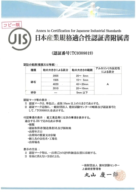 近年は、骨材に対する多様化したユーザーニーズにより、品質の安定化、高耐久性等、メーカー側も厳しい対応が求められています。このような中、当社は2008年4月に新JISを認証取得、大学との共同研究等、更なる品質改善に努めています。また、社員へは品質管理責任者及びコンクリート技士資格取得への積極的な取り組みを推進し、レベルアップを図っています。今後とも、品質管理を充実しユーザーに信頼される製品作りに注力していきます。