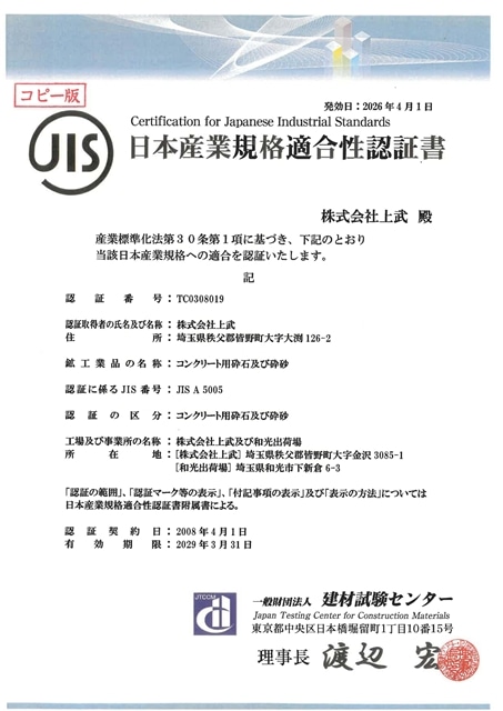 コンクリート分野拡大に向け、顧客ニーズ対応及び 更なるマ―ケティング強化を図るため、2008年4月に 新JIS認証を取得し品質管理に努めています。